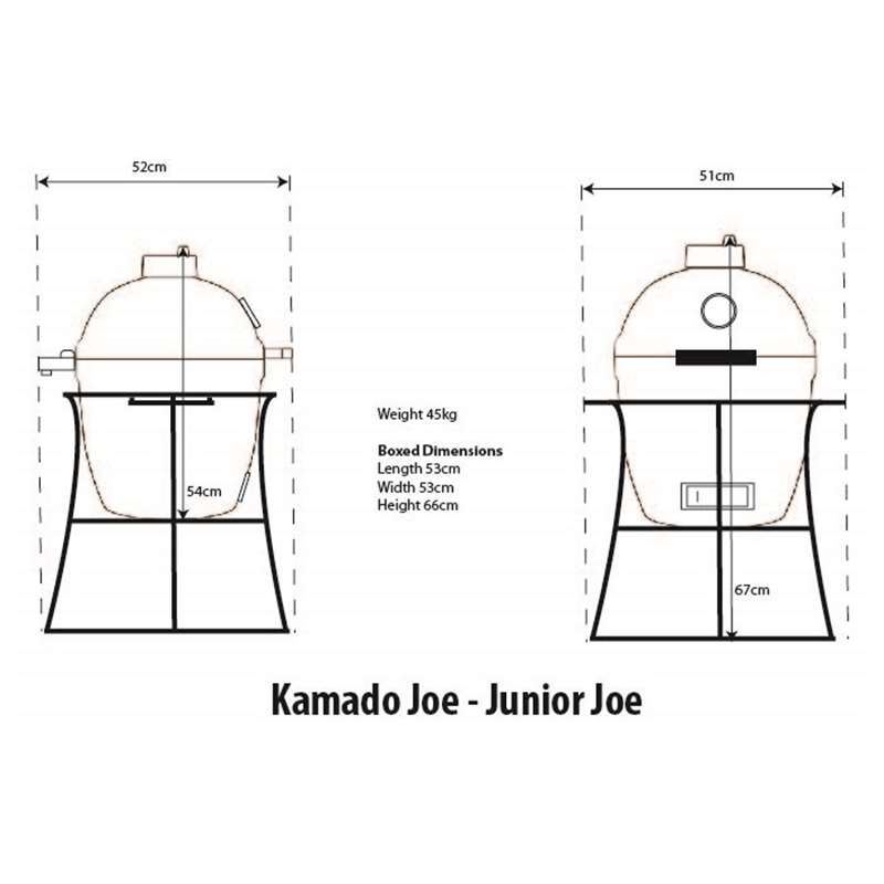 Joe Junior is a transportable version of the larger Kamado Joe BBQ smokers, delivering the same high-quality ceramic performance in a more compact and portable design. Smaller and around a third of the weight of the Classic model, Joe Junior weighs 31kg and measures 41cm (W) x 53cm (D) x 56cm (H), making it ideal for cooking at home or on the go.