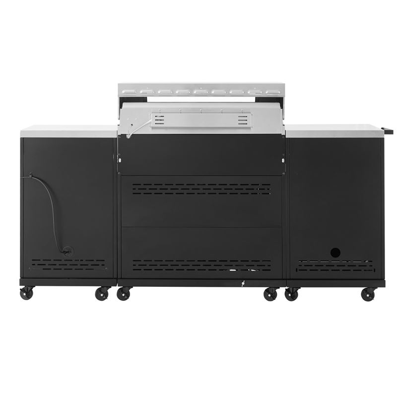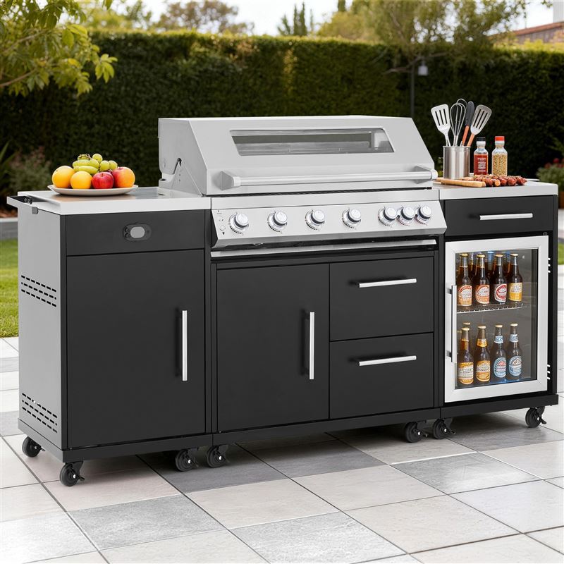 Designed as a complete outdoor kitchen solution, the unit includes an integrated fridge for keeping drinks and ingredients chilled and close at hand. Storage is built in through double-layer cabinet doors and drawers finished in black powder-coated steel with stainless steel handles, offering both durability and a sleek contrast to the stainless steel work surfaces.