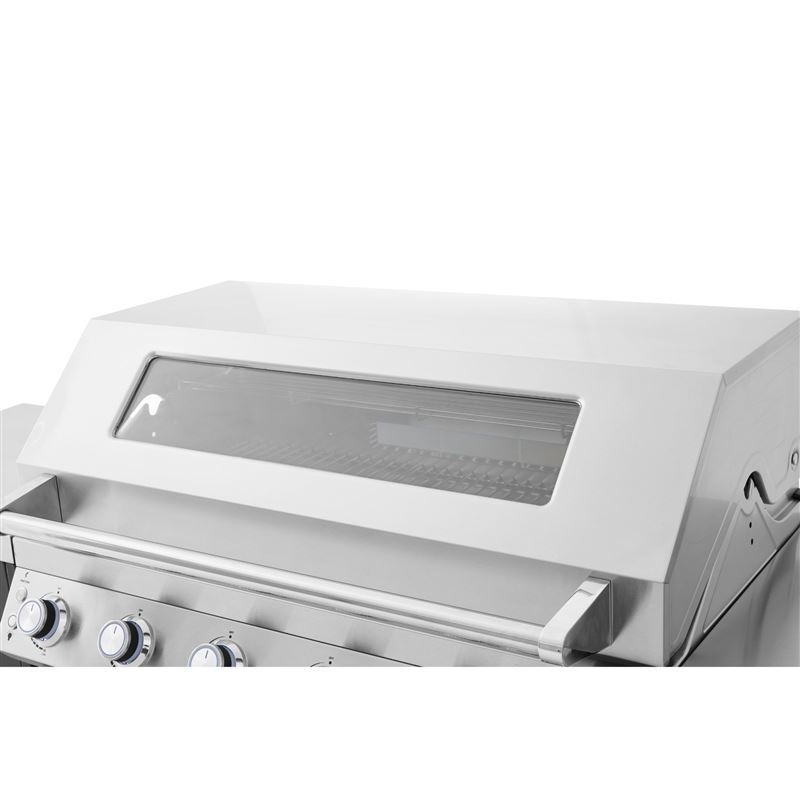 Constructed with extensive stainless steel components throughout, the outdoor kitchen delivers both strength and a premium finish. The double-layer stainless steel lid features a glass viewing window and built-in thermometer, allowing you to monitor cooking temperatures easily while retaining heat for controlled, efficient cooking. Stainless steel cooking grids, a warming rack and heat diffusers ensure even heat distribution across the generous cooking area.