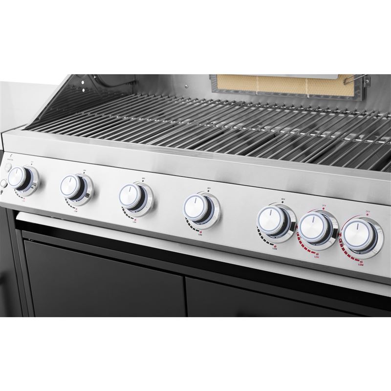 The powerful burner configuration provides exceptional versatility. Five main burners deliver consistent heat for everyday grilling, while the infrared sear burner is ideal for achieving intense heat for steakhouse-style searing. The infrared rear burner expands your cooking options further, making it suitable for rotisserie-style cooking and larger cuts of meat. LED-illuminated control knobs and a digital thermometer offer clear visual feedback, even when cooking into the evening.