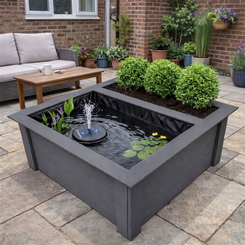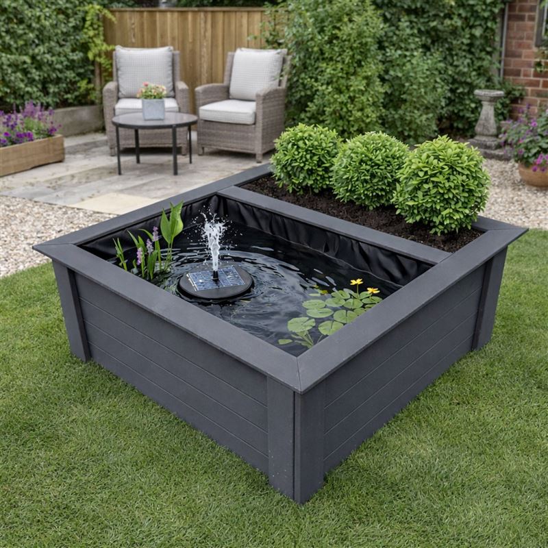 The square raised design includes a generous lateral planting zone, allowing you to introduce plants and colour alongside the pond to create a visually engaging garden feature. With a pond capacity of approximately 540 litres, it offers plenty of space for water movement while remaining compact enough to suit patios, decking areas or landscaped gardens.