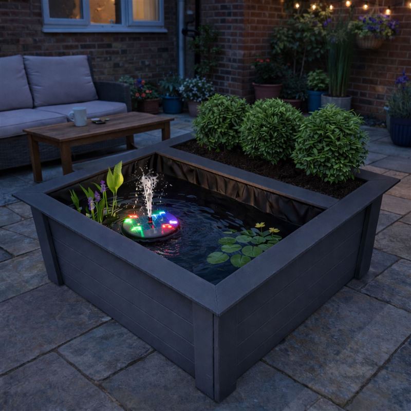 Supplied with a frost-proof pond liner, this pond is suitable for year-round outdoor use. The updated floating pump is powered by solar energy and includes a rechargeable function, ensuring continued operation during darker months or periods of limited sunlight. The pump also features an integrated LED light display with multiple colour options, creating an attractive illuminated water feature after dusk. With five different spray settings, you can easily adjust the water display to suit your garden style and personal preference.