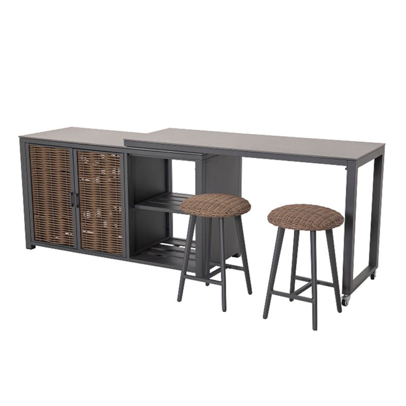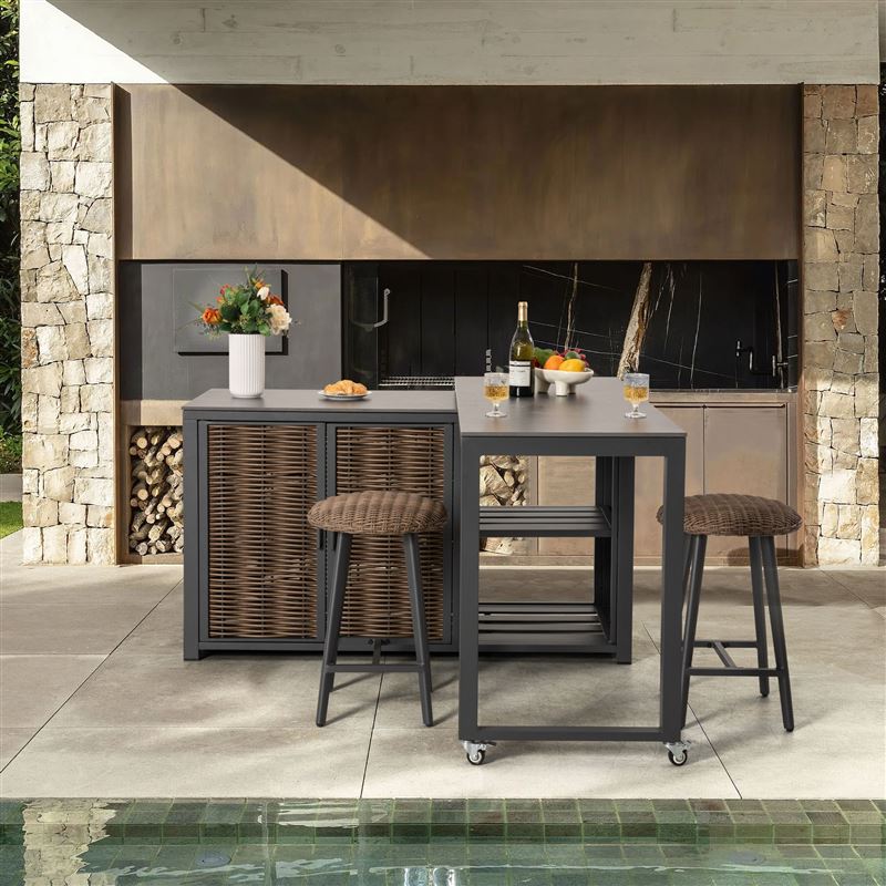 - Coordinated Wicker-Style Finish for a Cohesive Look - Matching wicker-effect finish on both the table cupboards and bar stools creates a unified, contemporary aesthetic that complements modern outdoor settings.