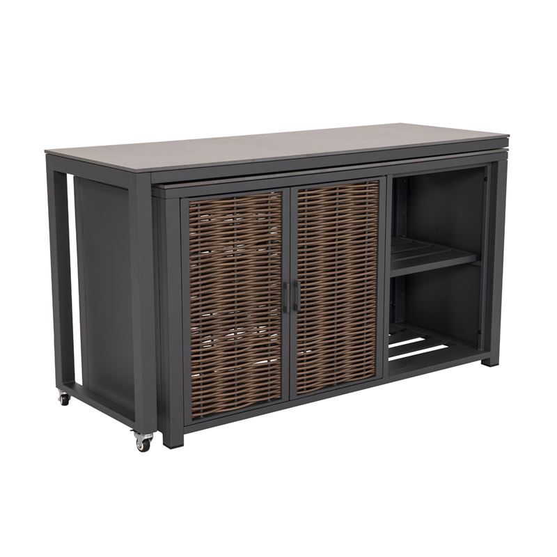 At the heart of the set is a spacious 1600mm tabletop that provides generous room for prepping dishes, serving meals or sipping drinks with guests. Integrated storage cupboards beneath the surface make it easy to keep outdoor essentials such as dinnerware, accessories and utensils organised and sheltered from the elements, helping your space stay neat and clean.