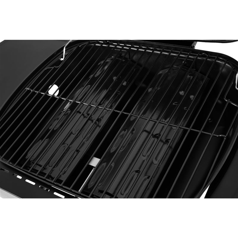 The two gas burners deliver a total output of 5.0kW, with individual controls and Piezo ignition for straightforward operation. Lava rock is included to help distribute heat evenly across the cooking surface, improving cooking consistency and helping to reduce flare-ups. The enamel-coated cooking grates provide a generous 47 x 37cm cooking area, complemented by a warming rack above, ideal for keeping food warm while the rest finishes cooking. With the lid closed, heat circulates evenly around the grill, allowing for controlled cooking similar to a convection oven. This makes it suitable not only for grilling sausages, burgers and kebabs with the lid open, but also for cooking thicker cuts of meat that benefit from gentler, indirect heat.
